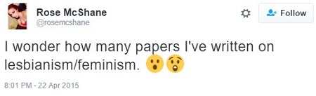 Ms. McShane, who was hired last year as a student assistant in the WGSS department and honored this year as “Outstanding Student” in the program, identifies as “femme lesbian” (“I fall a little in love with every lesbian I meet.”) and says that her sexuality inspired her feminism, an emotional topic she discussed in a class assignment.