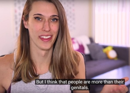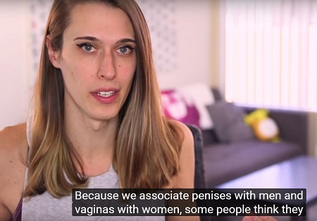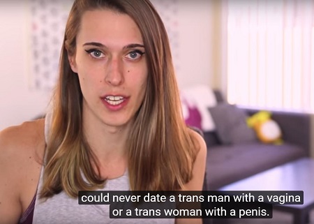 “Because we associate penises with men and vaginas with women” (gosh, I wonder why?) “some people think they could never date a trans man with a vagina or a trans woman with a penis.”
