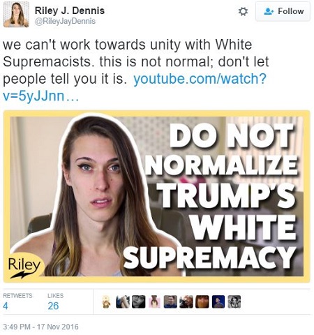 By the way, did I mention that Riley J. Dennis is a “pacifist . . . socialist, anti-capitalist” who voted for Hillary Clinton? Did I mention that Riley J. Dennis hates all 62 million Americans who voted for Donald Trump?