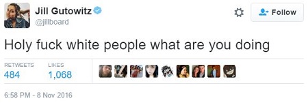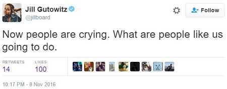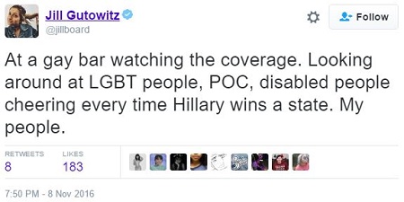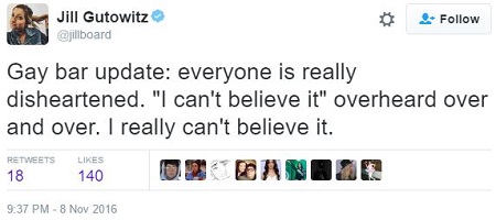 Jill Gutowitz (@Jillboard on Twitter) is a lesbian feminist Democrat from New Jersey who lives in Los Angeles, where she spent Election Night at a gay bar watching her entire world come crashing down in flames: