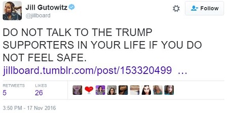 Another thing people keep saying is that you “MUST” talk to the Trump supporters in your life . . . I tried doing that this morning and that ended really, really badly for me. I was bullied and patronized, called names, ridiculed for being TOO educated, was told that I’m ruining friendships by trying to start a discussion and was tormented for being the “bad guy.” I want to tell you this; DO NOT talk to the Trump supporters in your life if you do not feel safe. I repeat. DO NOT TALK TO THE TRUMP SUPPORTERS IN YOUR LIFE IF YOU DO NOT FEEL SAFE. . . .