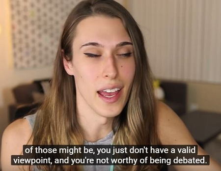 Getting the endorsement of Justin/Riley didn’t help Hillary Clinton with blue-collar voters in Pennsylvania, Michigan and Wisconsin, but this doesn’t mean the election has caused Justin/Riley to reconsider his/“her” political ideology. In fact, he/“she” just released a new video explaining why there is no need to debate Trump supporters because Trump supporters are Nazis, and “not worthy of being debated”: