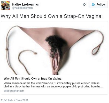 So, just to recap, Dr. Hallie Lieberman of the University of Wisconsin (a) wants to mandate health insurance coverage for dildos, (b) advocates providing pornography to minors, (c) is anti-marriage, (d) is pro-butt plug, (e) believes men should be required to own prosthetic vaginas and, in case you didn’t guess (f) hates Republicans. Well, let’s return to see what she was teaching in freshman English class:
