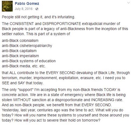 Gomez began blogging at the site Tumblr.com in 2011, but archives for his blog show he has been inactive on Tumblr since March. In 2016, Gomez’s activism seemed to shift toward supporting “Black Lives Matter.” In July, he posted a rant to Facebook about how “infuriating” it is that people were “not getting” what he called “a legacy of anti-Blackness” in America, the causes of which he listed as “colonialism,” “cisheteropatriarchy,” “capitalism” and “imperialism,” among others.