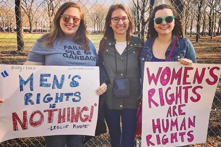 That’s Emily on the left, wearing a BuzzFeed “Failing Pile of Garbage” shirt and holding a sign with the slogan “Men’s Rights Is Nothing,” a line spoken by Amy Poehler’s character Leslie Knope in a February 2015 episode of the NBC series Parks and Rec. That line was considered a clever retort at a time when we were just a few months into the #GamerGate controversy and mere weeks after the Rolling Stone UVA rape hoax fell apart. In other words, feminists mocking their critics was a Hollywood laugh line in February 2015, but the joke had worn thin by the time the election rolled around in November 2016.