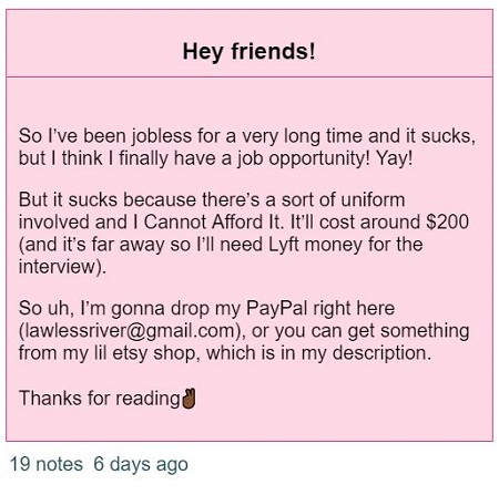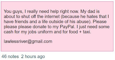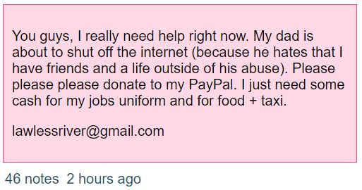 While you’re rethinking things, ma’am, you might want to rethink your addiction to creating new Tumblr identities all the time, because you have two other blogs (here and here) where you use the name Danika Lawless. So that’s three different first names — “River,” “Rain” and Danika — all with the same last name, Lawless, and it’s probably just a matter of time before somebody who actually knows you sees your YouTube channel and is like, “Hey, I went to school with that weirdo.” Then all your trash-talking about your family is going to come home to roost because, yeah, you’ve got yet another blog (danikablogsaboutstuff.tumblr.com) where you posted this fundraising appeal last July: