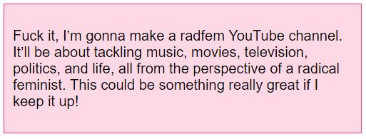 Those screencaps are from Ms. Lawless’s Jan. 23 video, “How To Make 2017 Year Of The Radfems.” Two days after the Women’s March on Washington, Rain/River/Danika was telling radical feminists “we need to bring our activism outside of the Internet and we have to be loud about it,” as if the massive protests on Jan. 21 weren’t “activism”?