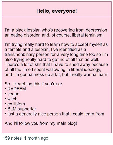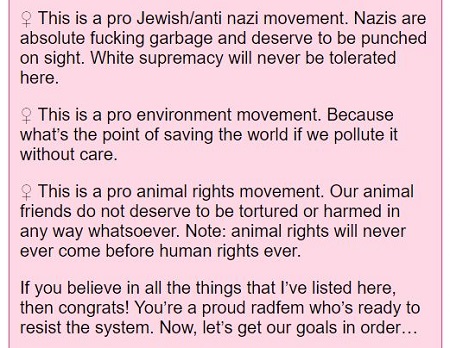 […] “Anti-Feminists … Are F-king Evil. They’re Such Disgusting Human Beings” Her Tumblr blog announces: “I’m Rain. black. bi. woman. witch. vegan.. learning about radical feminism one step at a time.” She launched her YouTube channel in December, calling herself “Rain Lawless.” […]