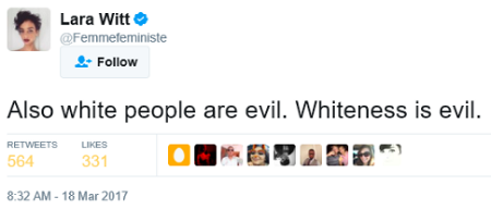 […] Dear White People: Lara Witt (@Femmefeministe) Hates You There is nothing surprising about feminist writer Lara Witt’s declaration: “Also white people are evil. Whiteness is evil.” […]