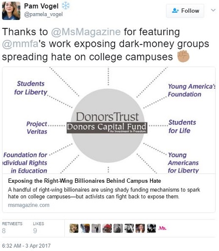 Pam Vogel works for the George Soros-funded group Media Matters.