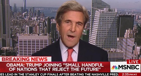 The liberal media’s all-Russia-all-the-time news coverage was interrupted yesterday when President Trump announced that he was repudiating the Paris Climate Accord, which the Obama administration had signed onto at the 2015 United Nations Framework Convention on Climate Change. And the reaction of failed 2004 Democrat presidential candidate John Kerry was typical of the sky-is-falling gloom-and-doom Chicken Little crowd. Failed 2000 Democrat presidential candidate Al Gore called Trump’s decision “reckless and indefensible.”