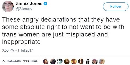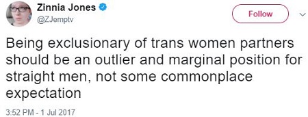 Here we arrive at the real bottom line of the LGBT agenda. Once disapproval is prohibited as “hate,” then the demand for “equality” makes participation mandatory. Anyone who refuses to engage in homosexual activity — which is what Zachary/“Zinnia”/“Satana” demands — is subject to the accusation of being “exclusionary.” For a man to declare his unwillingness to having sex with a carnival freak show like Zinnia Jones is “misplaced and inappropriate.” and heterosexual men must “try to work through” this aversion.
