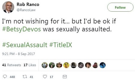 The tweet, which was posted by Robert Ranco, a partner with the Carlson Law Firm, read, “I’m not wishing for it…but I’d be ok if #BetsyDevos was sexually assaulted. #SexualAssault #TitleIX.”
