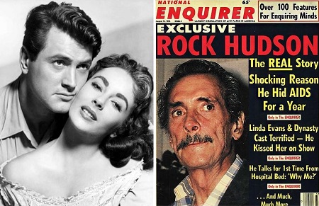 Rock Hudson with Elizabeth Taylor in 1956 (left) and in 1985 (right).