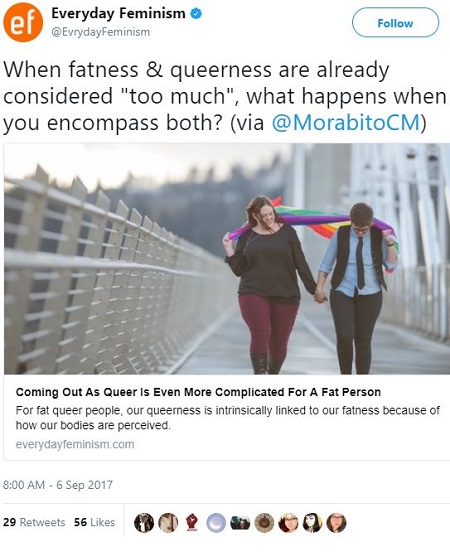 Like being publicly queer or trans, to be publicly and unapologetically fat is a political act. When a person is out as both unapologetically fat and unapologetically queer and/or trans, it requires an enormous amount of emotional labor that many thin, straight, and cis people take for granted. . . .