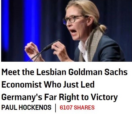 In the “intersectional” identity-politics calculus of American liberalism, of course, a lesbian like Alice Weidel is expected to be an ally of the foreign invaders, but Germany is not America, and Weidel is shrewd enough to recognize her own self-interest as more important than the slogans of multiculturalism. Islamic culture is both misogynistic and homophobic, and why shouldn’t a German lesbian oppose a Muslim invasion?