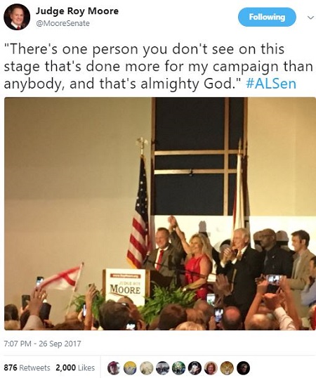Taking the stage after a solo rendition of “How Great Thou Art,” an exultant Mr. Moore said he had “never prayed to win this campaign,” only putting his political fate “in the hands of the Almighty.”