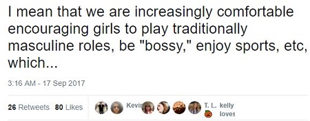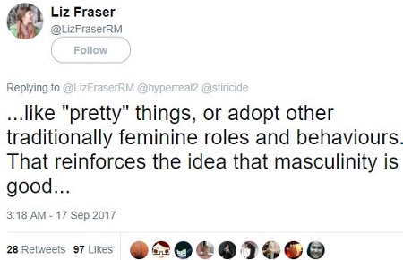“I mean that we are increasingly comfortable encouraging girls to play traditionally masculine roles, be ‘bossy,’ enjoy sports, etc, which is good and important and we should keep doing it, but we’re much less comfortable encouraging boys to express their feelings, cry, like ‘pretty’ things, or adopt other traditionally feminine roles and behaviours. That reinforces the idea that masculinity is good and femininity is undesirable. Universal masculinity isn’t a solution to patriarchy, it’s another form of oppression.”