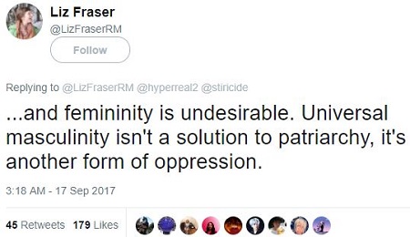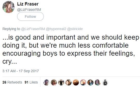 Beyond the anti-male regime within the education system, however, there is the problem of “feminist motherhood” — an oxymoronic concept, given the feminist movement’s fanatical pro-abortion activism. Nevertheless, there are feminists who have children, and they are committed to raising their offspring in accordance with the movement’s ideology, and this means discouraging their sons from being masculine. Canadian feminist Liz Fraser unloaded this Twitter lecture last month: