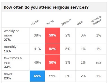 “Family values” still matter. When push comes to shove, marriage and religion are decisive influences in electoral politics. When we look at these factors in Wisconsin — a state that Trump won by a narrow margin — the only demographic groups that went for Clinton were (a) unmarried women and (b) those who never attend religious services.