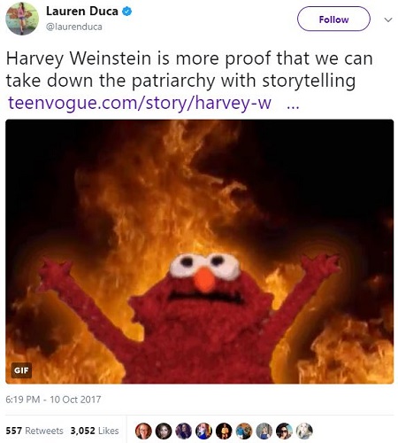 Harvey Weinstein’s behavior was an “open secret” in Hollywood for decades. Where was Lauren Duca’s feminist “storytelling” all those years? Why wasn’t it necessary to “take down the patriarchy” when Bill Clinton was assaulting Paula Jones, Juanita Broaddrick, Kathleen Willey, et al.?
