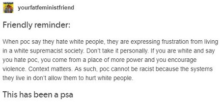 This post — which accumulated nearly 30,000 notes in three months — was written by a 22-year-old African-American woman named Antonia (“Nia”), who goes by “Lucidnee” online. What struck me about this post is how it represents the feminist slogan “The Personal Is Political” dumbed-down to Tumblr-level stupidity. It’s feminism for the 85 IQ crowd.