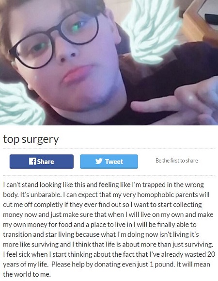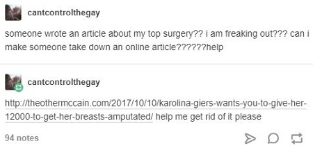 Karolina Giers is a university student who for five years has run a Tumblr blog called “Can’t Control the Gay.” She had long identified as a lesbian, but in October, she posted a fundraising appeal for £9,000 (about $12,000) on GoFundMe in order to pay for “top surgery” (mastectomy):
