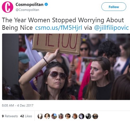 A lot of women, even those who didn’t previously and perhaps still don’t label themselves “feminists,” seem done with nice. And the explosions that come when nice girls let out years (or decades) of pent-up indignation are messy and chaotic. . . . A significant number of women are no longer worried about being nice or alienating men. . . .