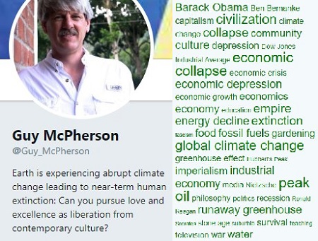 Guy McPherson’s Twitter (left); the cloud-tag at his blog (right).