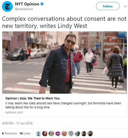 Ansari is 36 years old, and he can’t read signals? That’s another baffling aspect of this story, how a grown man who had hitherto enjoyed a reputation as a progressive “woke” guy completely misread his date’s mood. Here’s a suggestion: He should have ended the date after dinner.