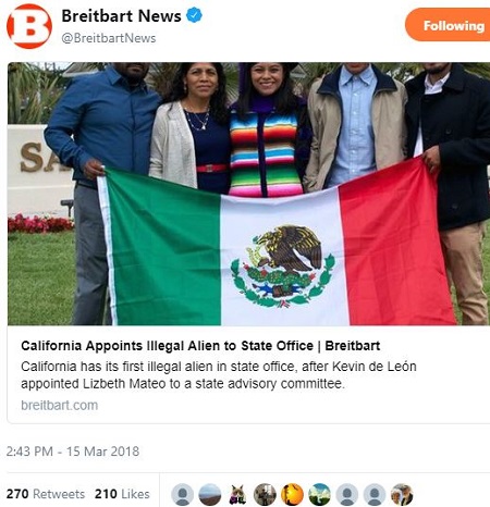 California has its first illegal alien in state office, after Senate President pro Tem Kevin de León (D-Los Angeles) appointed Lizbeth Mateo to the California Student Opportunity and Access Program Project Grant Advisory Committee.