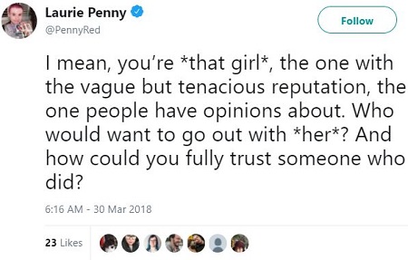 While pretending to be a victim of misogyny, ostentatiously writhing in agony on her self-made cross as a heroic martyr of the feminist cause, in fact the reason Laurie Penny is so hated is because she is a bad person — selfish, dishonest and cruel — as I explained in March 2016: