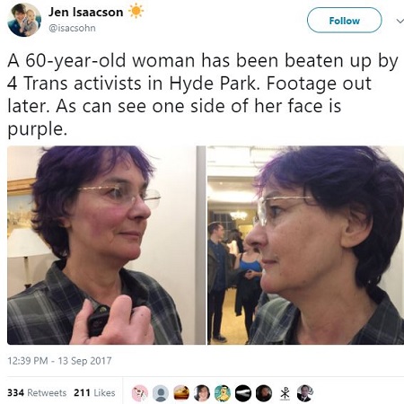 We return, then, to the situation of Linda Bellos. In September 2017, transgender activists made worldwide headlines when they attacked 60-year-old feminist Maria MacLachlan at a Hyde Park speak-out.