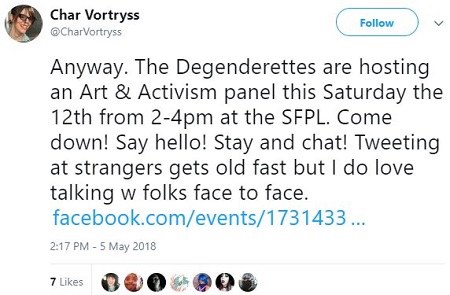 Char Vortryss is the transgender alias of 34-year-old Clinton James Crawford, who in February 2017 was one of three people granted petitions by a San Francisco judge “to change their gender to ‘non-binary’ — meaning they are legally neither male nor female” according to California courts. Vortryss’s spouse Xin Farrish is also “non-binary.” Vortryss concluded his/“her” Twitter thread by announcing a panel the Degenderettes will host Saturday at the San Francisco library.