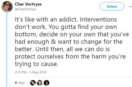 “Until you come to understand that your dogma is harmful [and] decide to find another way, ‘debate’ is pointless,” Vortryss said in a Twitter thread. “It’s like with an addict. Interventions don’t work. You gotta find your own bottom, decide on your own that you’ve had enough [and] want to change for the better. Until then, all we can do is protect ourselves from the harm you’re trying to cause.”