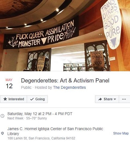 Furthermore, the exhibition of art created by the Degenderettes at the Hormel Center has been subject to a misinformation campaign run by trans-exclusionary radical feminists (TERFs) and far-right extremists. Pieces of the exhibit have been decontextualized and misrepresented in order to draw negative attention to both the Degenderettes and the San Francisco Public Library. The talk-back will feature moderation and steps will be taken to ensure the safety of attendees, but it is important for us to note that there may be greater attention on the event due to the above.