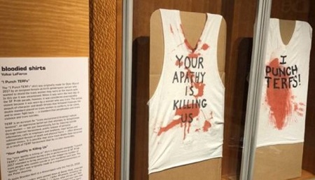 Last month, the San Francisco Public Library announced that it had made changes to an exhibit by Vortryss’s group, the Degenderettes, after complaints from patrons about “artwork that could be interpreted as promoting violence.” Among the exhibits in the Degenderettes display was a blood-stained T-shirt with the slogan, “I punch TERFs.”
