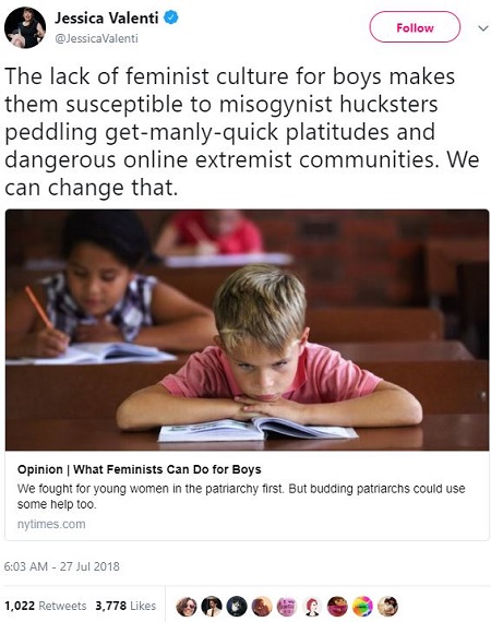 Jessica Valenti is dishonest in pretending she wants to “help” boys. She hates your sons. She wants them to be as miserable as she is. Her ideas about “intervention” — a “feminist culture for boys” — are simply about teaching boys to cooperate in their own destruction.