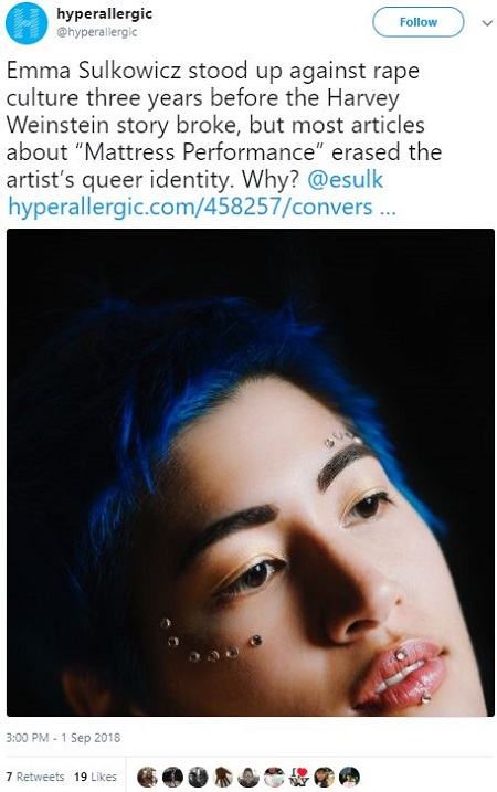 Despite the many articles and Wikipedia pages that refer to Sulkowicz as a woman, they actually identify as gender non-conforming and use the pronouns they/them. The omission — or dare I say the erasure — of Sulkowicz’s queer identity indicates the public’s continued unwillingness to reckon with the notion that queer people can be victims of sexual violence. . . .