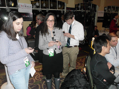 Reporters compulsively check their Twitter feeds on their 4G phones. The lady in the black-and-white coat is Shushana Walshe of ABC News.