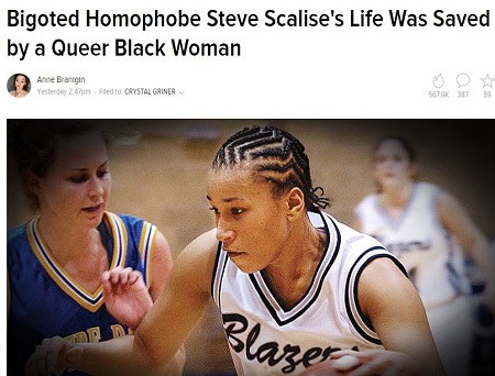 Really? Fusion.com exploits the fact that a black lesbian is a member of the Capitol Police force to label a wounded Republican congressman a “bigoted homophobe.” Has Steve Scalise, or any other GOP member of Congress, advocated a policy that would prohibit hiring of black people, women, or homosexuals as Capitol Police? No, that never happened, and so labeling Scalise a “bigoted homophobe” is merely a continuation of the anti-Republican rhetoric that inspired “passionate progressive” James Hodgkinson to open fire Wednesday morning.