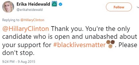 The RCP’s advocacy of “civil war” is not idle chatter. We have seen in the past three years how the Democrat-supported racial terrorist movement Black Lives Matter incited violent riots in Ferguson, Baltimore, and Charlotte, and sparked assassinations of police officers. Not surprisingly, Erika Heidewald is a big fan of Black Lives Matter.