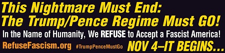 “Our protest must grow day after day and night after night—thousands becoming hundreds of thousands, and then millions—determined to act to put a stop to the grave danger that the Trump/Pence Regime poses to the world by demanding that this whole regime be removed from power,” states a call to action on the RefuseFascism website.