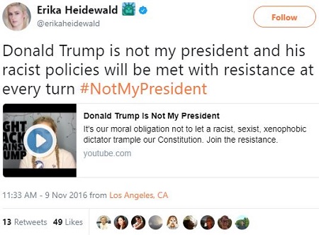 Like other Democrats who have rejected democracy, Ms. Heidewald was inspired by Mrs. Clinton’s defeat to declare Donald Trump “Not My President,” and create a YouTube program “Resistance News Network.”