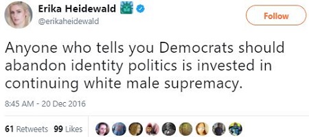 This endorsement of Black Lives Matter, like her embrace of the RCP, puts Erika Heidewald on the extreme fringe of American politics. However, this L.A.-based lesbian feminist actually represents the mainstream of young Democrats who have internalized the identity-politics ideology of their party in the post-Obama era. The irrationality of her rhetoric — including her claim that the only alternative to identity politics is “white male supremacy” — reflects the crisis of a party that is intellectually bankrupt and at a historic low ebb of influence.